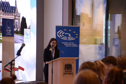 The day began energetically in anticipation for the week ahead. The first location – the Peace Palace - gave the Bulgarian delegation a warm welcome. Group photos, short interviews, and lively conversations with the other delegations kicked off the day before the official ceremony began with a speech by the mayor of The Hague, H. E. Mr. Jan van Zanen. His words were candid and expressed sincere faith in the delegates and the path they were taking. He found it inspiring to see a hall filled with enthusiastic representatives from different countries, ready to discuss important issues and work for the unity of the European Union.